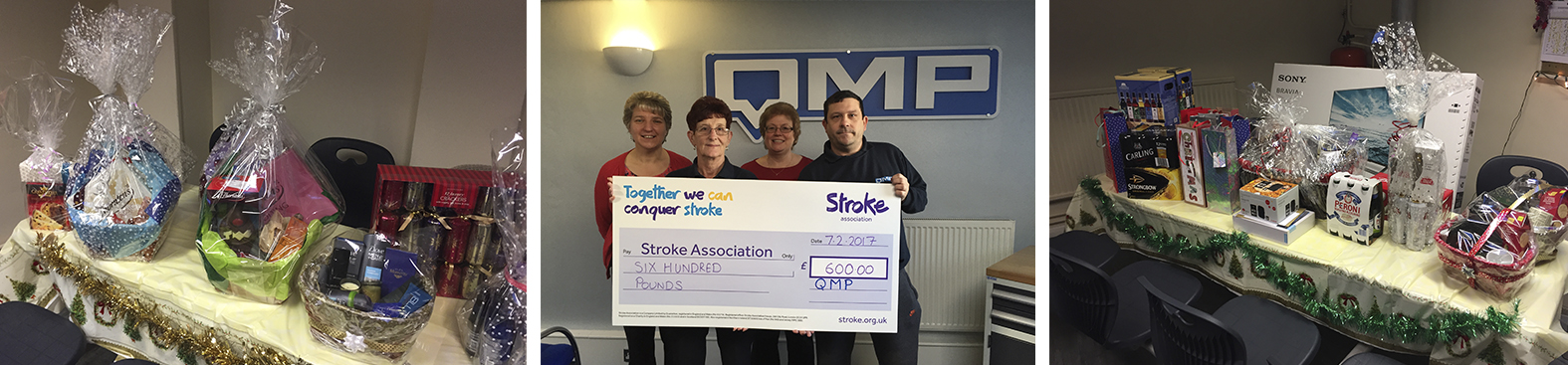 In December 2016 QMP held a Christmas Charity Raffle for the Stroke Association West Midlands and Williams Syndrome. These two charities do so much to help those affected by strokes and Williams Syndrome and here at QMP we wanted to help contribute to the amazing work they do. The QMP directors and staff kindly gifted prizes to raise money for the chosen charities. Some of the raffle prizes included, a 49” SONY Bravia TV, a digital camera, a computer tablet, beauty vouchers and shopping vouchers. Luxury christmas hampers were also provided by staff which included items such as coffee, food, chocolate, wine, beer, ale and also beauty packs! Tickets were sold to QMP staff, family & friends, and with the help of everyone we were able to raise an AMAZING total of £1200.00 which will be split evenly between both charities.
