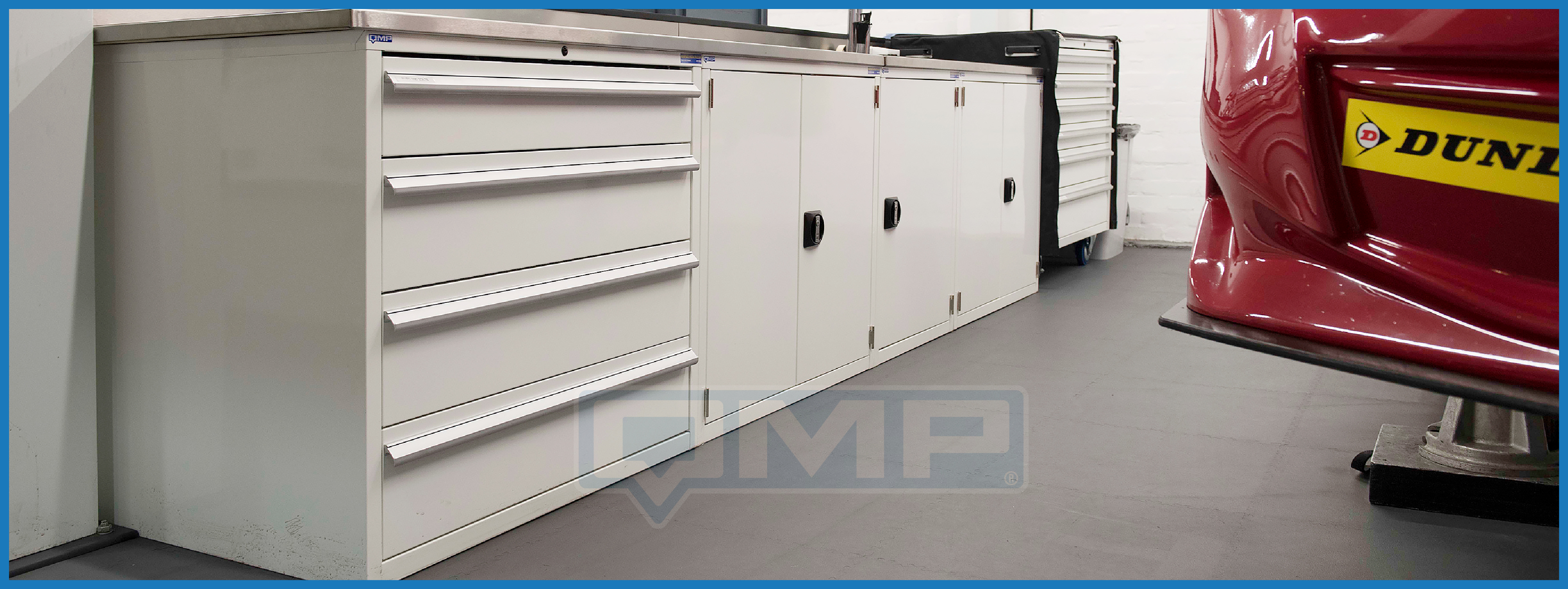 The bespoke fit out design provided for Eurotech Racing comprised of a selection of our Euroslide cabinets powder coated white with stainless steel worktops. The Eurotech Racing workshop was also provided with a Euroslide Workbench, powder coated Light Blue, to match their fleet of race-spec Mini’s. The Euroslide range offered the Eurotech Race team the perfect balance of functionality and aesthetic style in their workshop.