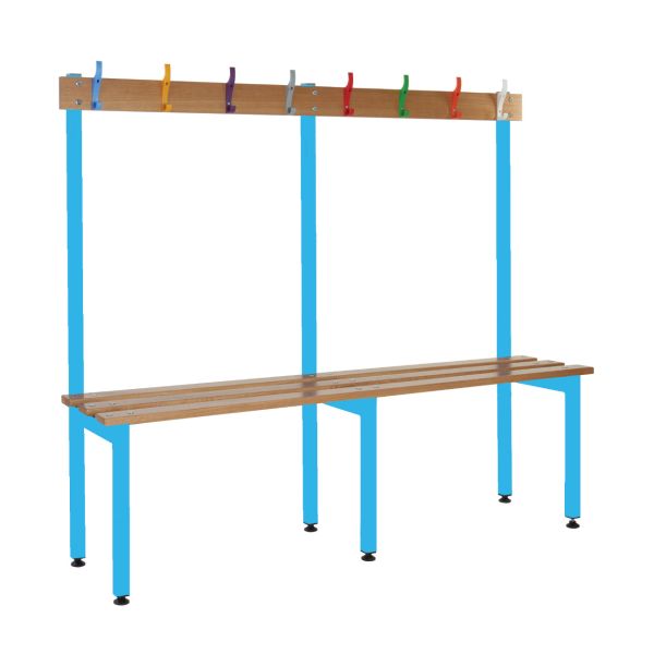 School Cloakroom Island Bench - Single Depth - Light Blue Frame - 8 Hooks - L.1200 W.1500 D.300