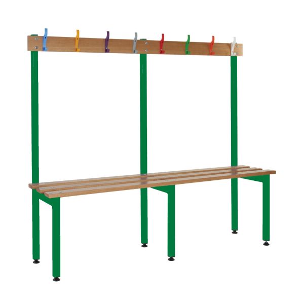 School Cloakroom Island Bench - Single Depth - Green Frame - 8 Hooks - L.1200 W.1500 D.300