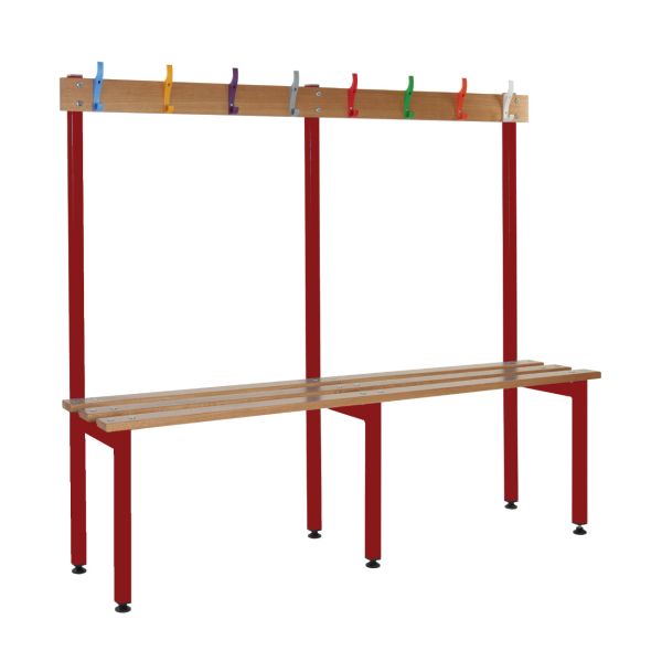 School Cloakroom Island Bench - Single Depth - Red Frame - 8 Hooks - L.1200 W.1500 D.300
