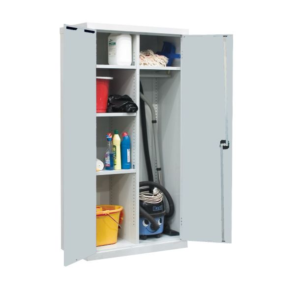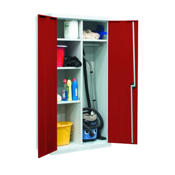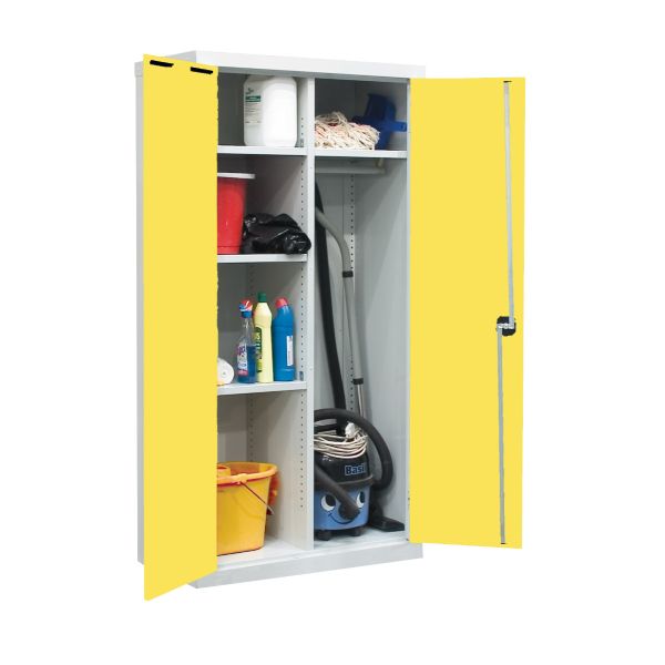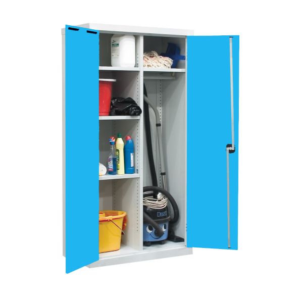 The Utility Cupboard range offers a heavy-duty storage cupboard suitable for janitorial and cleaning items in the workplace. Perfect for everyday use within industrial, commercial or office environments. A central divider separates the cupboard into two with a large compartment and top shelf and 3 shelves in the other compartment. Strengthened steel doors and a 2-point locking system keep your items safe and secure from unauthorised access. Available in a variety of colours, you can be sure to find a door colour to match your workplace environment.